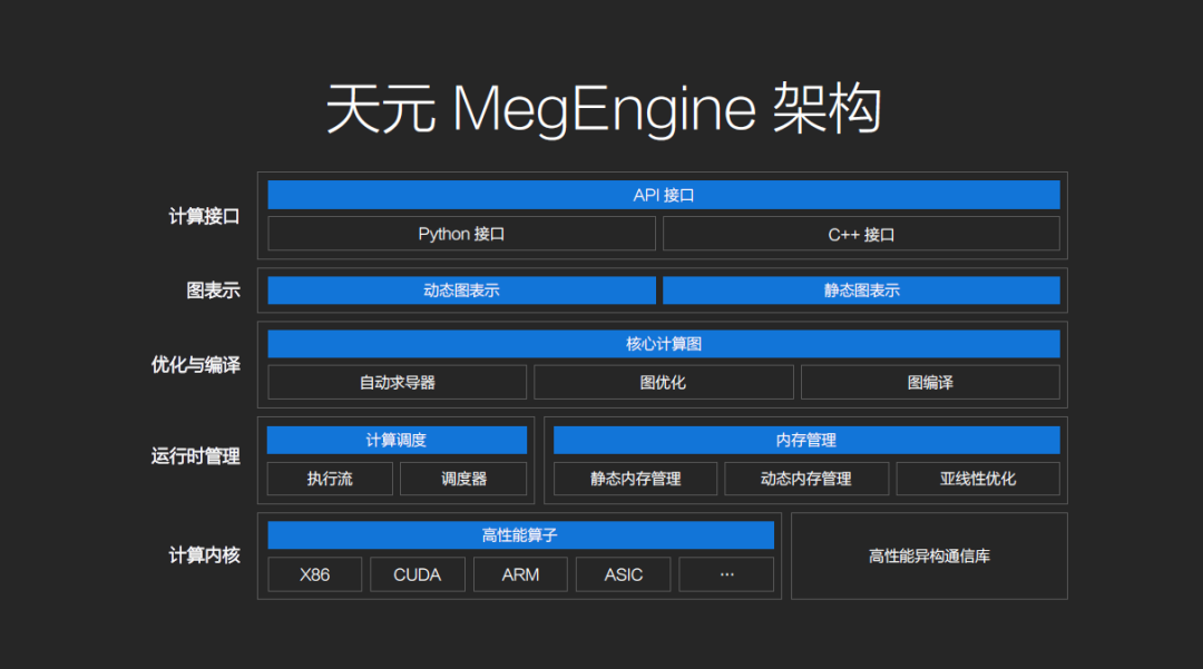 发布会上,天元开源项目的产品负责人田忠博详细介绍了天元的技术细节。天元是一套训练推理一体化、动静态合一的工业级深度学习框架,架构上具体分为计算接口、图表示、优化与编译、运行时管理和计算内核五层。