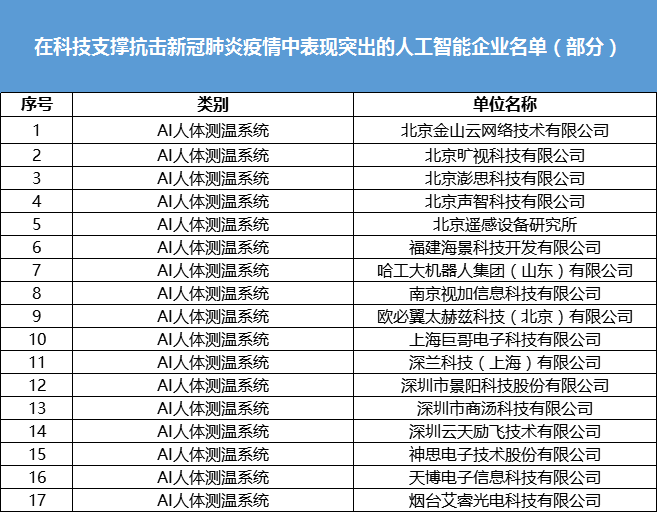 图:旷视入选工信部“在科技支撑抗击新冠肺炎疫情中表现突出的人工智能企业名单”( 以拼音首字母排序)