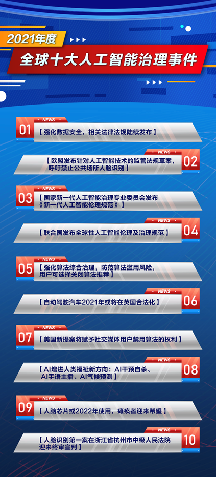 为此,人民智库与旷视AI治理研究院第二次成立联合课题组,并邀请中国人工智能产业发展联盟(AIIA)为课题支持单位,共同开展“2021年度全球十大人工智能治理事件”(以下简称“十大事件”)遴选、评议,组织相关领域权威专家学者和企业代表,以《新一代人工智能伦理规范》中提到的六条原则(具体是:人类福祉、公平公正、隐私安全、可控可信、责任担当、伦理素养)为遵循,依据理论价值、实践价值、新闻价值、研究价值等四个评价标准进行评议,并对国家相关部委、行业协会领导,高校院所专家学者以及人工智能产业领域从业者等典型群体进行深入访谈。经综合各方面资料、数据、意见、观点,最终得出2021年度全球十大人工智能治理事件和事件背后的发展趋势。