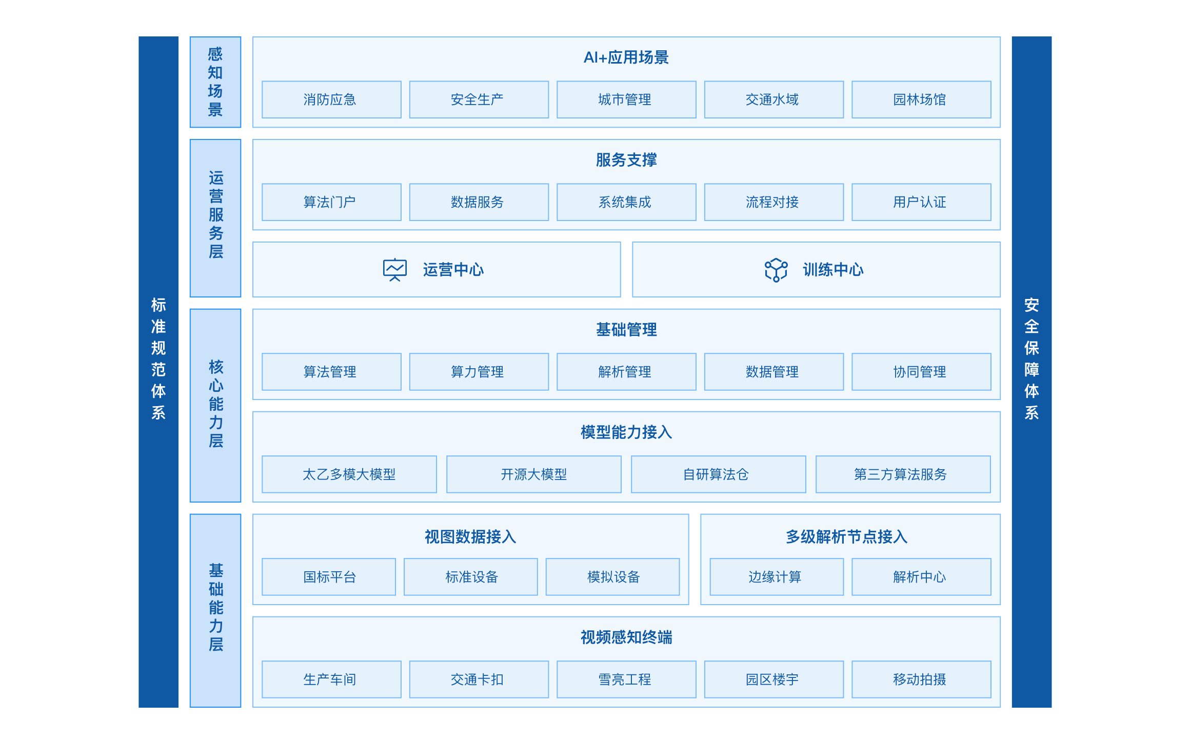 兼容三方算法和边缘计算设备,可按需增加解析单元和边缘计算节点,扩展多级解析服务能力,构建多网融合、市区镇街多级联动的“云-边-端”一体化协同感知体系。